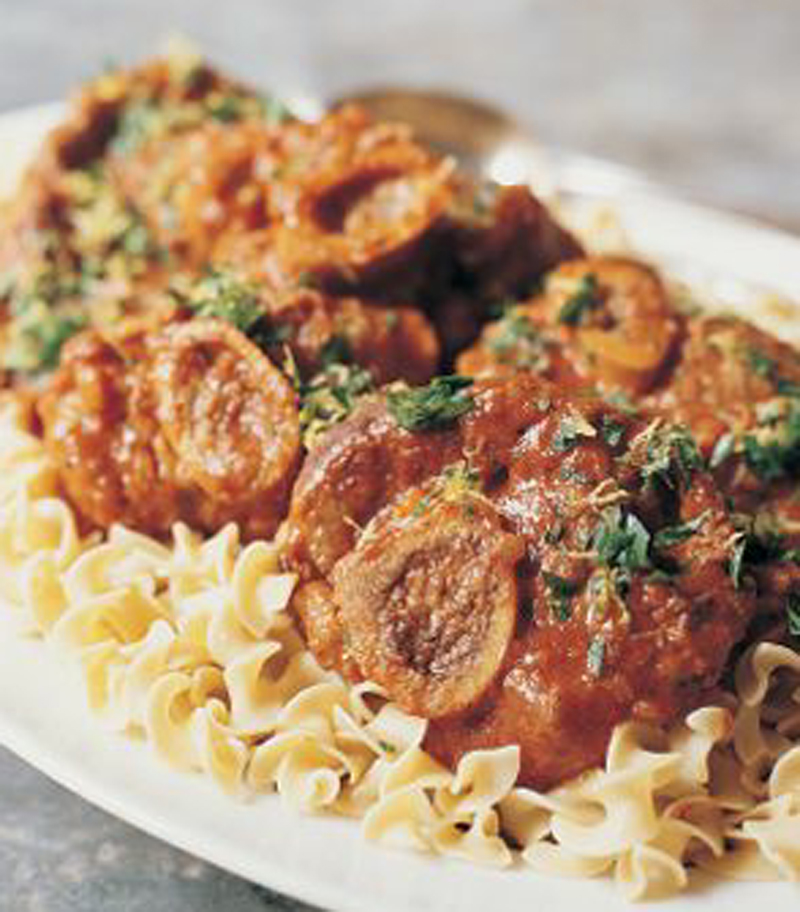 Succulent, falling-off-the-bone veal in a thick, full-flavored sauce is a quintessential Italian dish. Besides the lush meat, osso buco offers up a serving of rich marrow from the center of its bone. If little spoons are unavailable, use the tip of a sharp knife to ease it out. Riding above the symphony of tastes, like the clear notes of a trumpet, is the herbaceous, fruity, and pungent garnish known as gremolata.