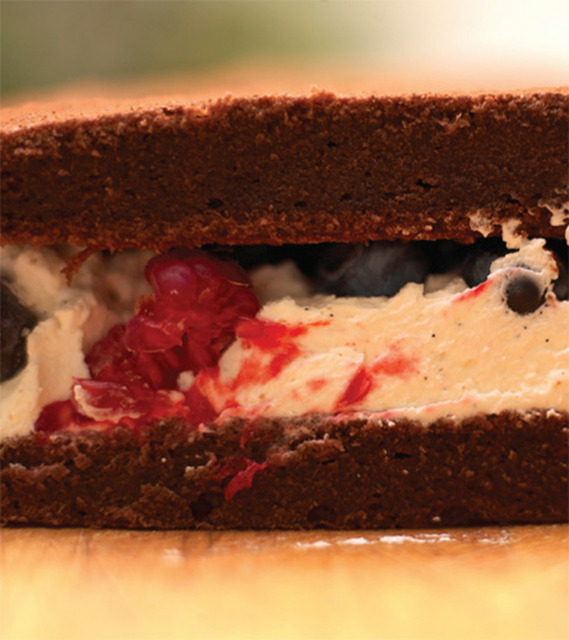 - Spoon the filling onto the flat side of two of the cakes. Scatter with fruit and then cover each with the remaining cakes. Dust the top of the pies by putting cocoa powder in a sieve or tea strainer and shaking it over the top.