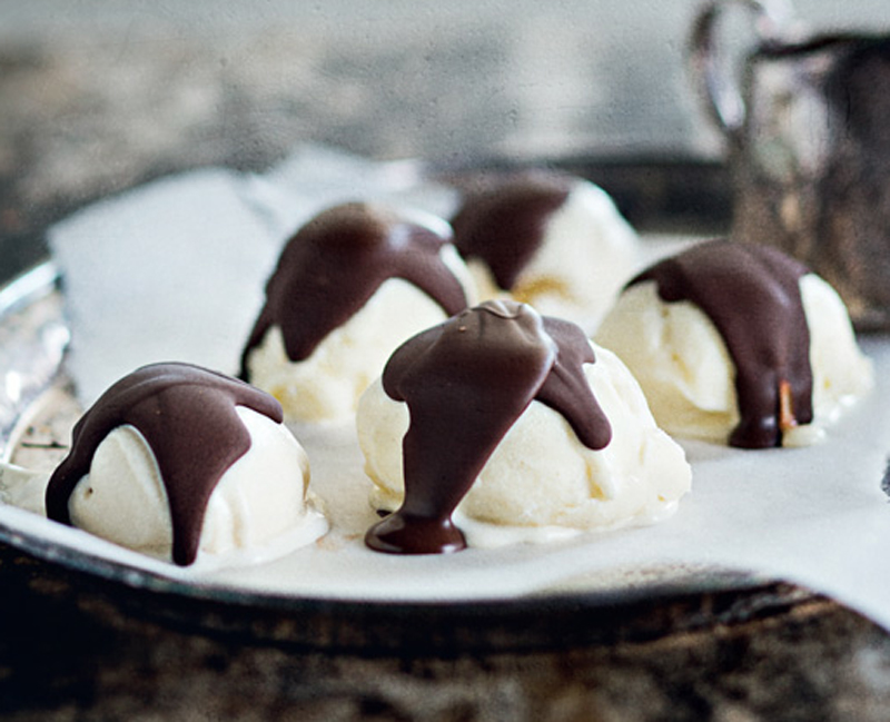 - Melt the chocolate in a glass bowl over a saucepan of simmering water, and set aside to cool. Remove the ice-cream cubes from the trays and dip into the melted chocolate. Place the cubes onto a baking tray and back into the freezer (keep frozen at all times). Remove from the freezer when you are ready to serve.