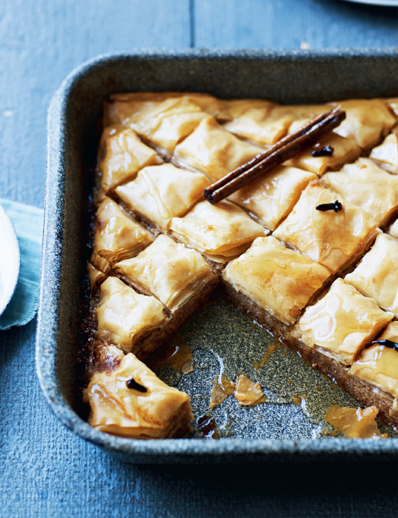 - Set another four to six layers of filo on top, buttering between each layer. Cut the baklava diagonally into 3–4 cm (1¼–1½in) diamonds in the tray.