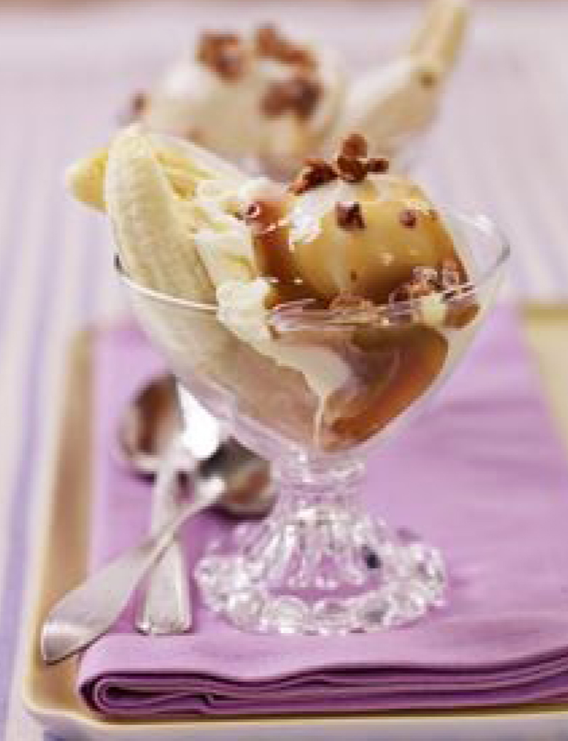 - Cut each banana in half crosswise and then in half lengthwise to make 8 quarters. Place 2 banana quarters in each of 4 stemmed glasses or 4 individual serving bowls.