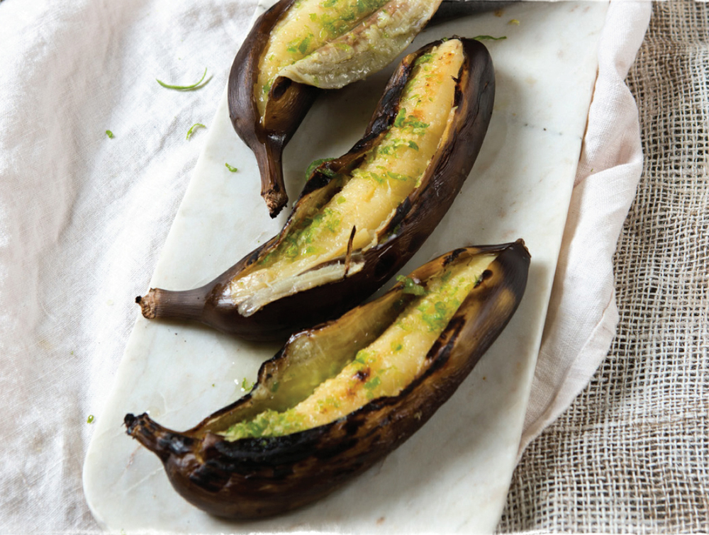 3. Roast the bananas in their skins on the grill until blackened on all sides. While still hot (being careful not to burn yourself), peel back the skin and brush the lime and coconut mixture over the bananas. Sprinkle with the lime zest and serve immediately.
