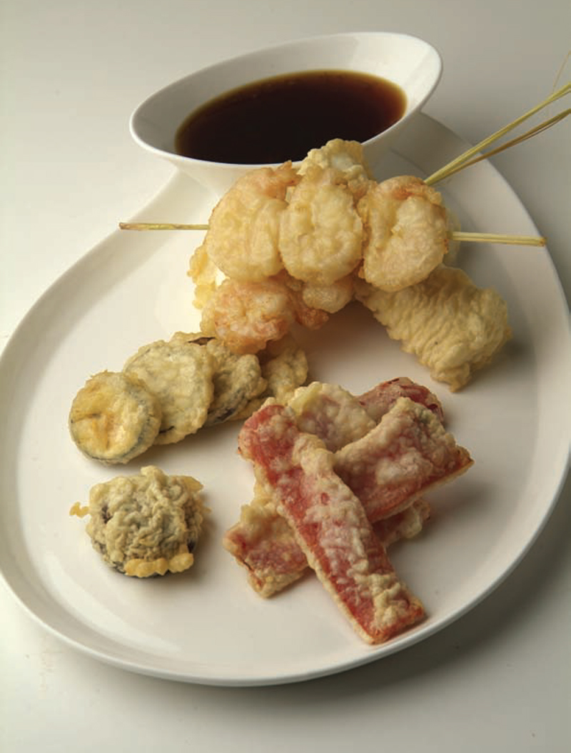 Tempura is an example of both foreign influence and local adaptation, as this style of cooking was introduced by Portuguese traders and then refined by Japanese chefs. The main difference between tempura and Western-style deep-fried foods is the lightness of the batter coating and the lack of greasy oil left on the foods. The consistency of the batter, the quality of the oil, and a proper frying temperature all are important factors in yielding this quality.