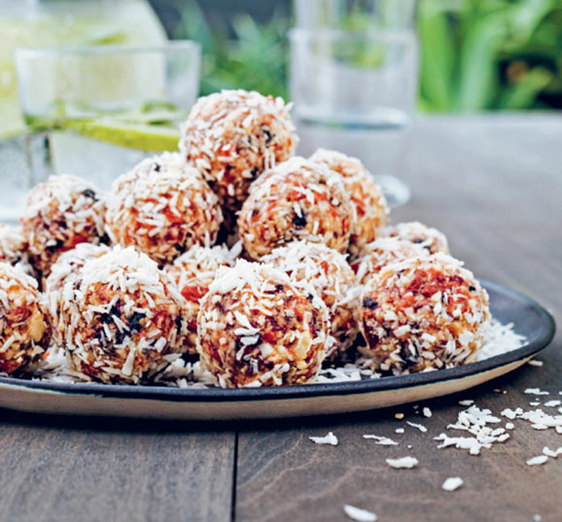 - Put the nuts and salt into a food processor. Blitz until they are chunky but not finely ground, then add the berries, dates, baobab fruit powder and coconut oil, and blitz until the mixture starts clumping together it doesn’t have to be puréed or too finely ground, you still want bits.