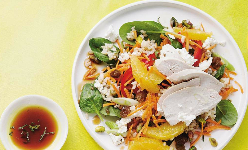- Place the rice, carrot, pepper, orange segments, spinach, spring onion, raisins and pistachios in a medium bowl. Drizzle over the dressing, season with salt and pepper, if desired, and toss gently to combine.