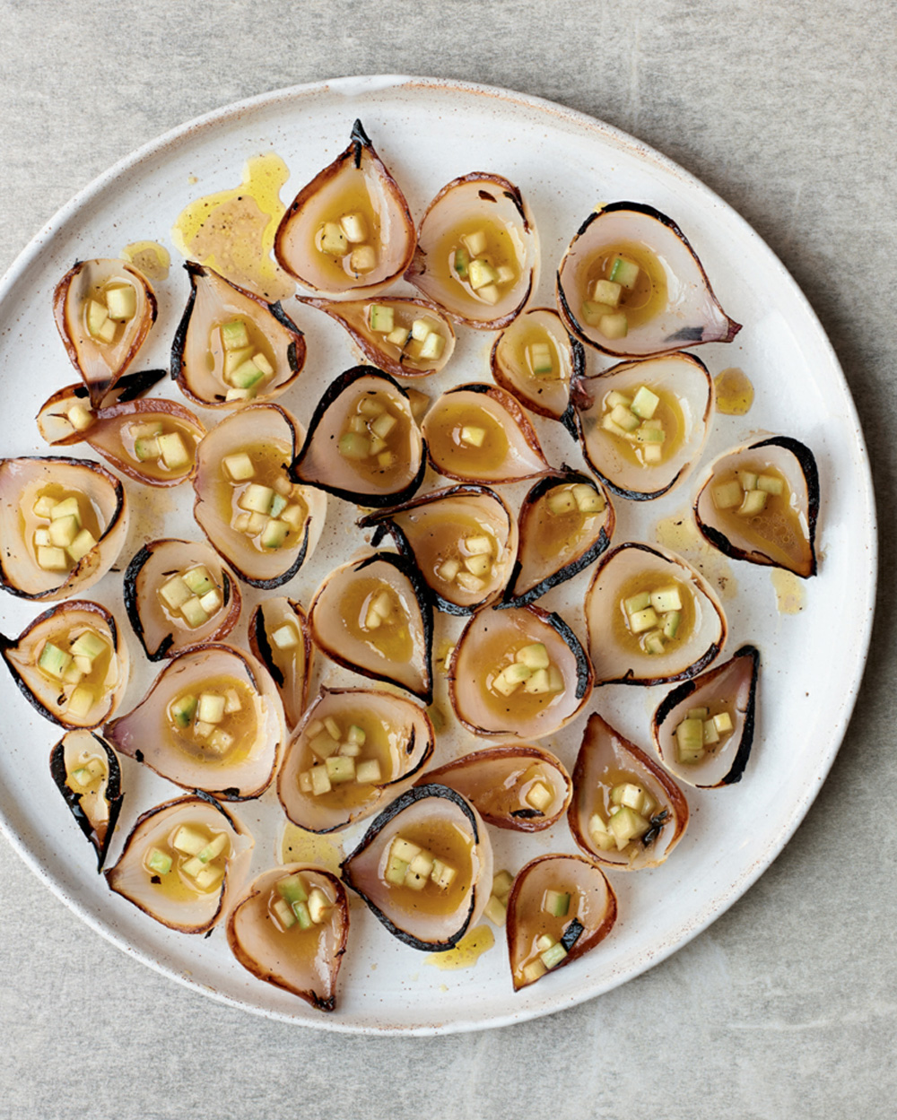 If you see French sweet onions (Roscoffs, ideally) in the shops or online, snap them up. They’re naturally sugary and need only a little heat to make them agreeable to eat. That said, here their cut faces are given more than a little, as they’re left to blacken fully in a hot pan. During that time, the rest of the onion softens just enough and then, when it is pushed apart, you’re left with the prettiest of charred, tender, sweet petals, which cup cooling cubes of cucumber and a nutty, sharp dressing. The whole thing is reminiscent of lip-puckering pomegranate molasses-dressed onions at a Turkish restaurant.