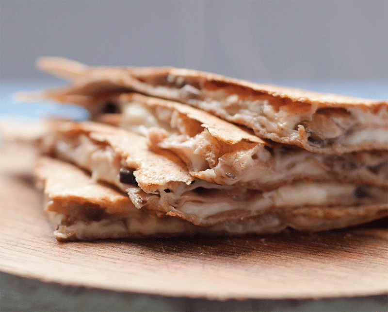 - You’ll have to make these in two batches. Heat a nonstick frying pan until hot and slide in the first tortilla. Scatter a quarter of the cheese over and cover with a slice of ham and half the mushrooms, then top with another quarter of cheese and a second tortilla.