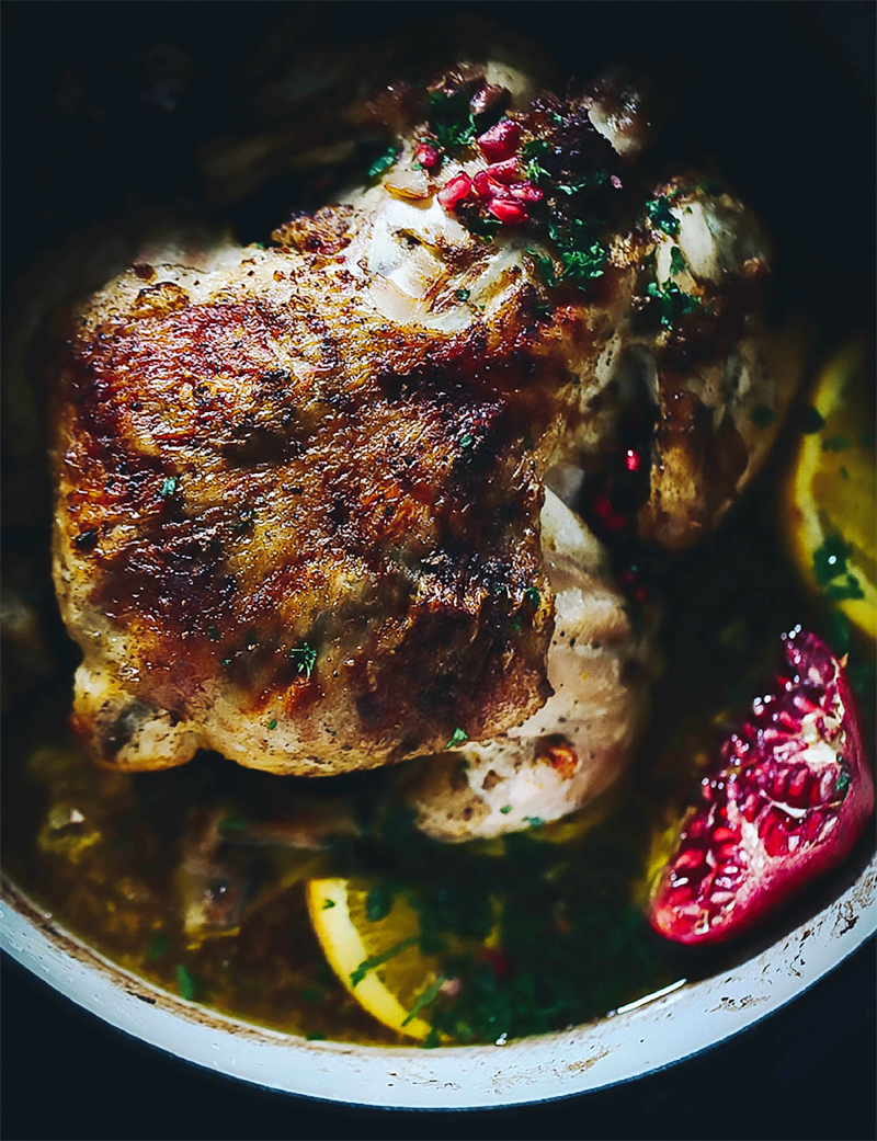 - To serve, pull or cut the meat off the bones and present it family style on a platter. Taste the sauce for seasoning, adding a little more salt and pepper, if needed. Spoon the sauce down over everything and sprinkle the pomegranate arils on top. Garnish with the fresh chopped parsley. Serve with bread and wild rice to sop up all the sauce, if desired.