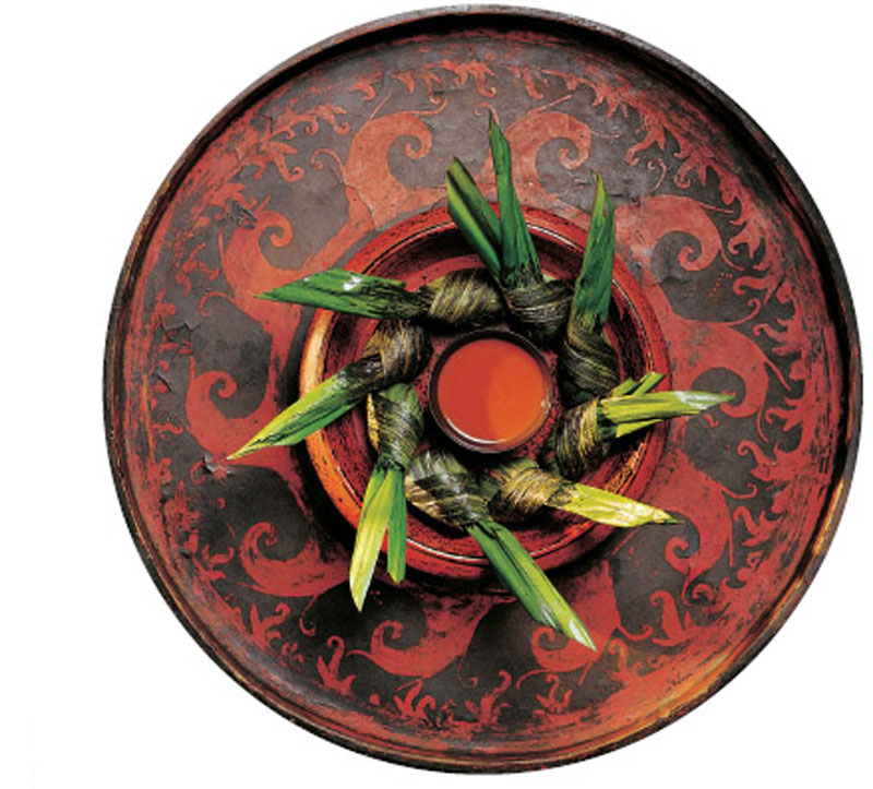 Fragrant screwpine or pan-danus palm leaves add their subtle fragrance to this deep-fried chicken dish, which is the Thai version of the popular Chinese Chee Pow Gai (Paper-wrapped Chicken).