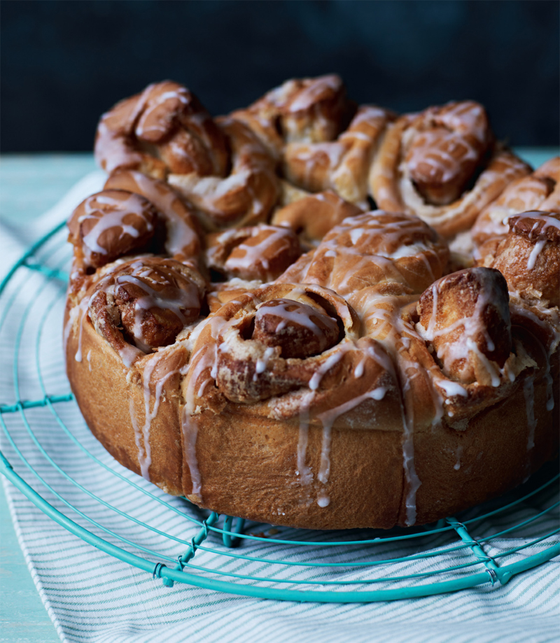 A large ‘cake’ of individual buns, each their own spiral around sweet, sticky cinnamon butter, all topped with a drizzle of icing.