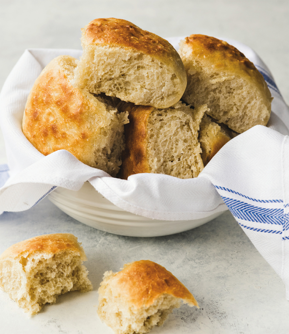 - Dust a work surface with the remaining 3 tablespoons of the flour and scoop the dough onto the surface. Dust your hands with some of the flour and roll the dough into a log. Divide into 8 equal portions and roll each portion into a smooth ball, pinching the bottom seam.