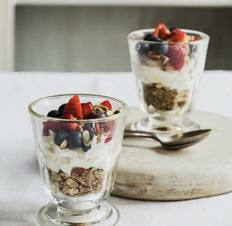 - When ready to serve, spoon a scant ½ cup granola into each of two glasses or bowls, keeping a little back for the top. Moisten with the orange juice. Mix the yogurt with the apple and spoon it over the granola, then top with the strawberries and blueberries and sprinkle with the remaining granola.