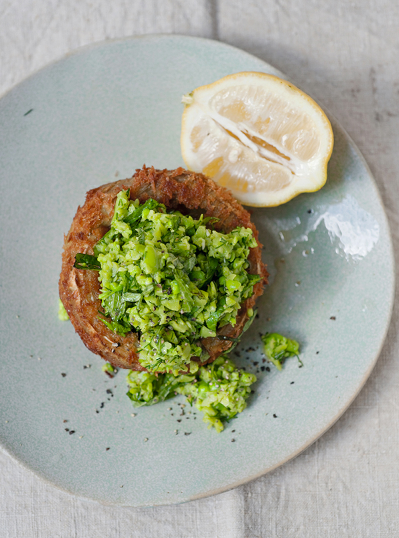 2. Put the shelled beans into the bowl of a food processor. Add the garlic, 4 tablespoons olive oil, ½ teaspoon of the salt and some black pepper, and crush the beans roughly in a few pulses (you can also do this by hand using a fork). Make sure you don’t process them into a purée. Set aside.