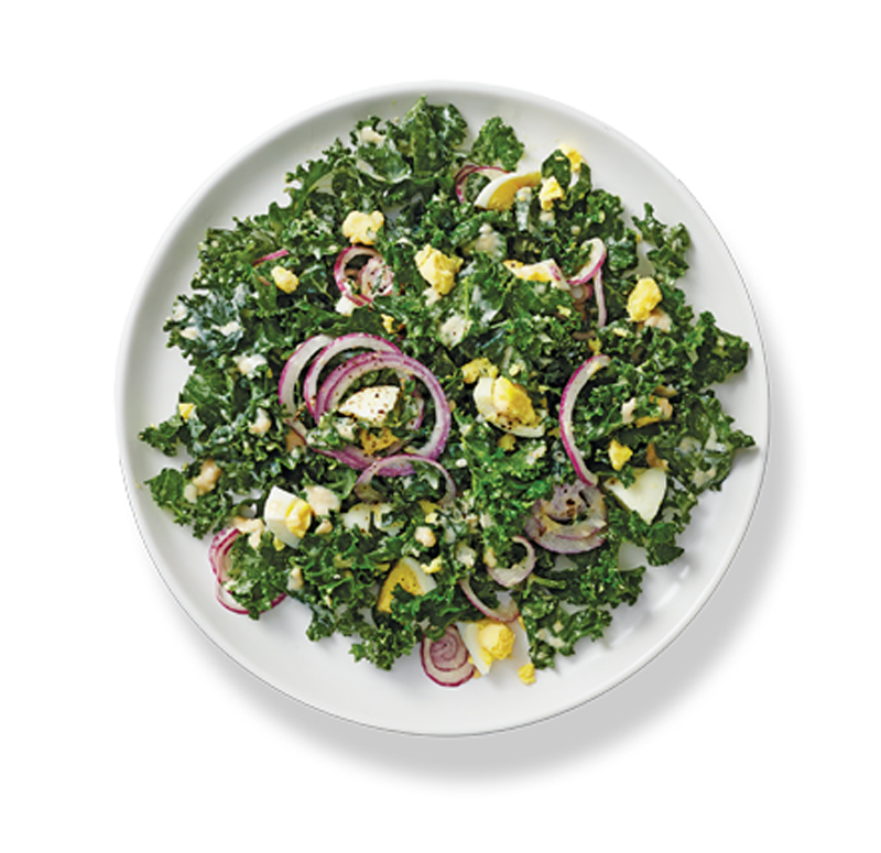 - Add the kale, eggs, and onion and toss to combine.