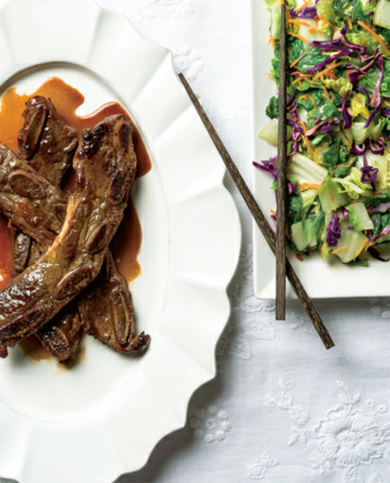- Remove the ribs from the marinade, reserving the marinade, and arrange in a large sauté pan (with a lid). Set over medium-high heat and sear for about 4 minutes each side, until the ribs are browned.