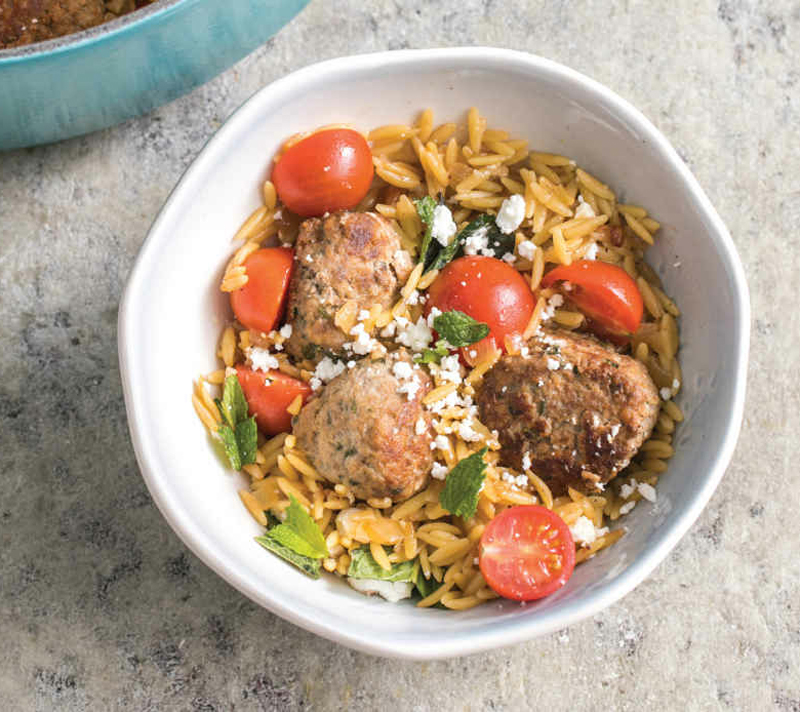 - Reduce heat to medium-low and nestle meatballs into orzo. Cover and cook until orzo is tender and meatballs are fully cooked through, 5 to 10 minutes. Sprinkle with tomatoes, feta, and torn mint. Serve.