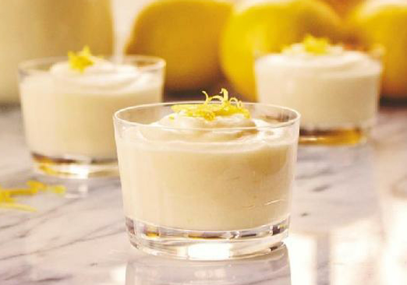 - Whisk in yogurt. Layer lemon mousse and strawberries alternately in eight individual dessert bowls. Chill till they have set. This takes three hours or so. Serve.