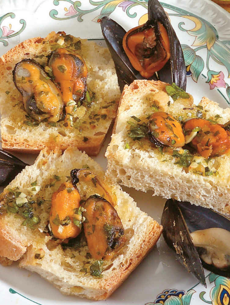 - Cut the bread into 8 slices, and carve a small hole in the centre of each. Fill each bread slice with the mussel mixture, and arrange on a baking sheet. Bake in a preheated 350° oven until the bread is toasted.