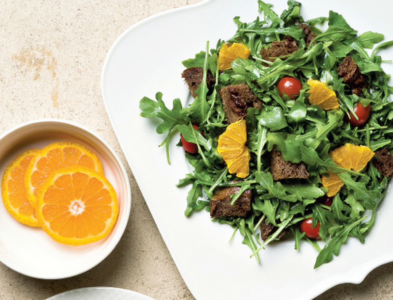 Traditionally, panzanella is made using stale bread. I prefer to toast fresh bread. Citrus adds just the right amount of sweetness to balance the salt of the chicken and the bread. Arugula can be strong for young palates. A lettuce blend works well as an alternative.