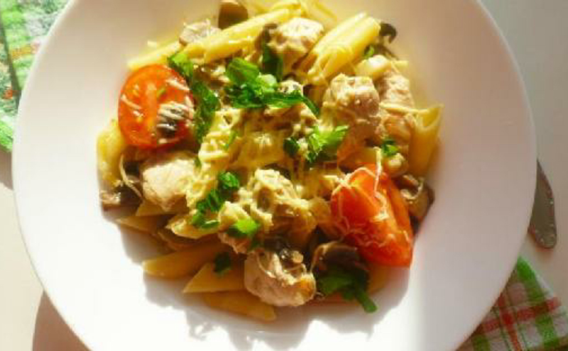 - Boil pasta according to instructions in salted water. In a saucepan heat the oil, fry the finely chopped onions and mushrooms.