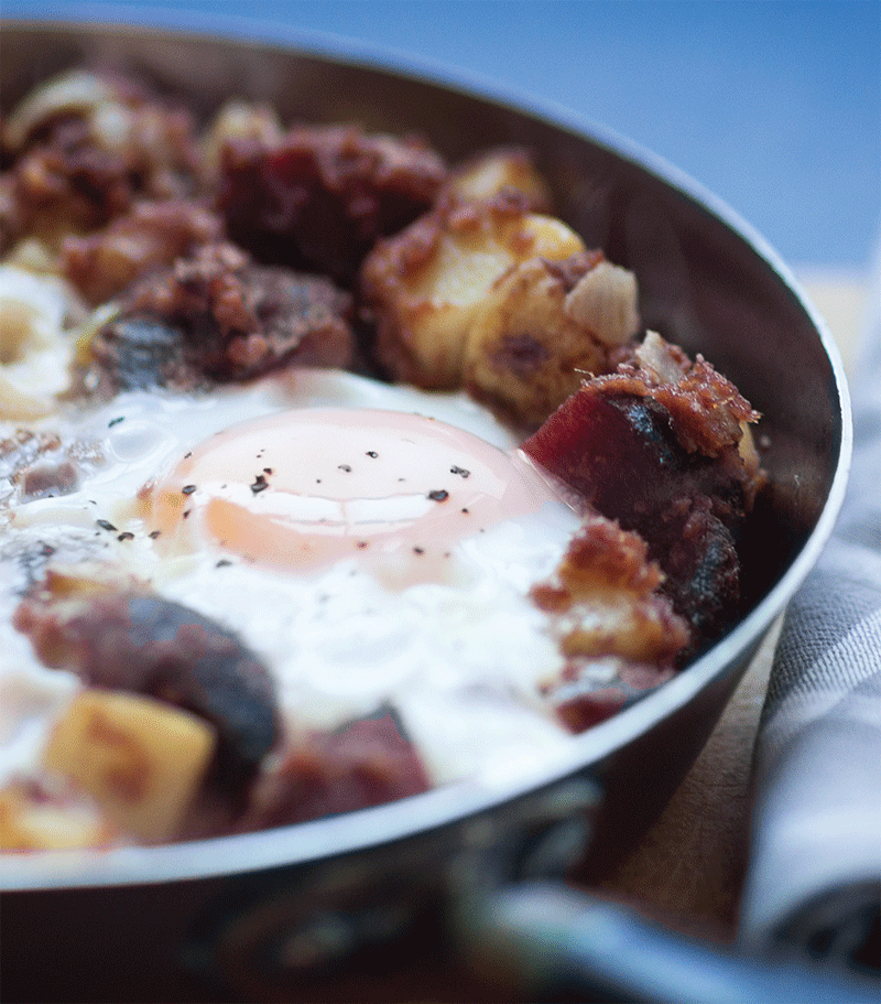 - Add the corned beef and the beetroot, season and heat through for a couple of minutes. Make four indentations and break the eggs into them.
