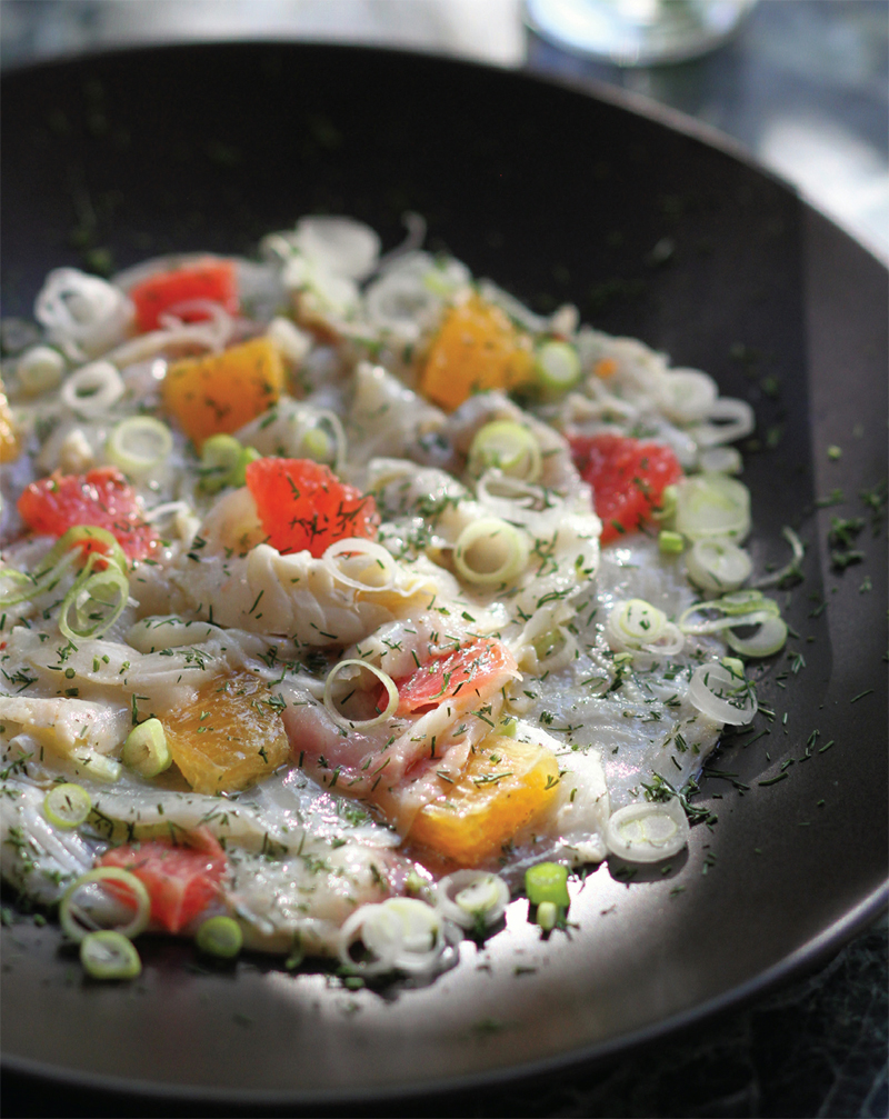 There are a few very region-specific recipes for raw salted or marinated fish in the Greek kitchen, mostly in areas with a deeply rooted fishing tradition, such as Lesvos, where the local sardines are savored after just a few hours in salt. But the delicate crudo-type dishes that have become so popular witness the poke phenomenon are newcomers to the Greek table and were initiated by the country’s most creative chefs, who started a trend using Greek herbs and alcoholic beverages as marinades for raw fish. Mediterranean sea bass, one of the most important farmed fish in Greece, makes a beautiful carpaccio. Its delicate flesh pairs perfectly with the citrus flavors and dill that give this particular carpaccio a traditional Greek flair.