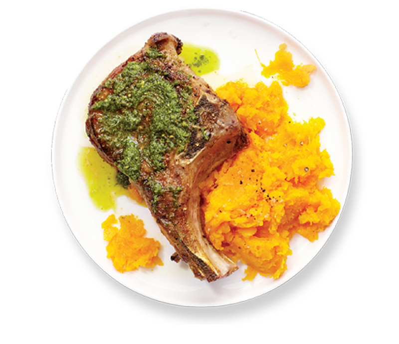Seared pork chops and pesto with mashed squash recipe