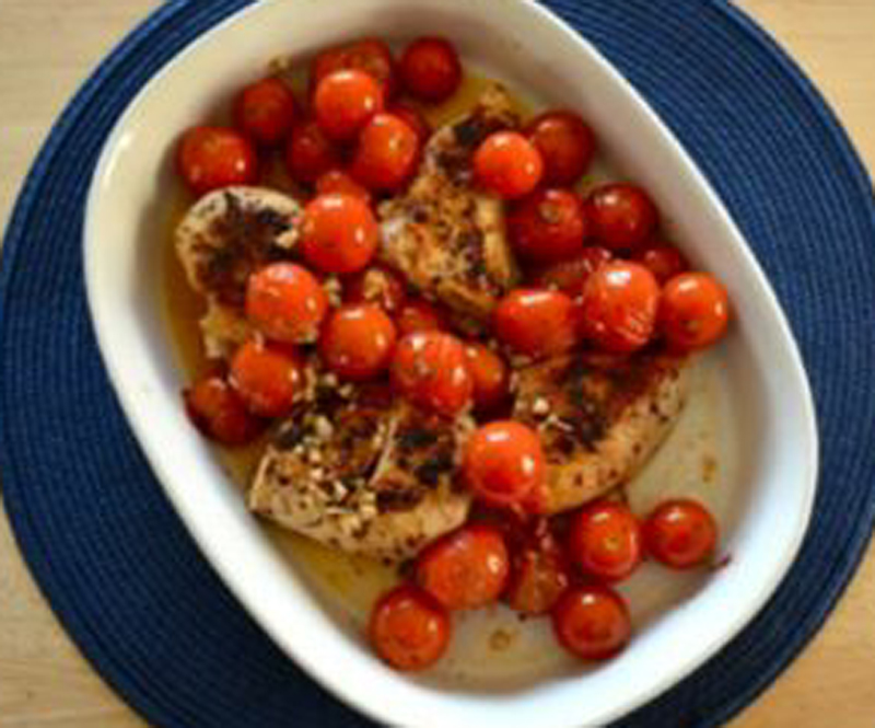- Heat oil in the same skillet. Add tomatoes and garlic; cook, stirring, until garlic is golden, about 2 minutes. Add vinegar, water, parsley, and remaining ¼ tsp salt and ¼ tsp pepper; cook, stirring until tomatoes begin to soften, about 2 minutes longer. Spoon over and around chicken.