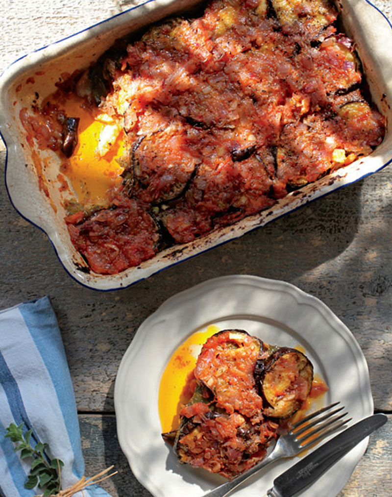 5. Oil a 6-quart ovenproof casserole or Dutch oven. Spread 2 tablespoons of the onions and garlic on the bottom. Mix with 2 tablespoons of the grated tomato. Season with a little salt and black pepper. Arrange all of the potatoes in a single overlapping layer on the bottom, over the tomato-onion mixture. Season lightly with salt and black pepper. Next, in this order, spread: bell peppers, more onion-garlic-tomatoes, a little fresh oregano, salt, and black pepper; then eggplant, more onion-garlic-tomatoes, salt, black pepper, and oregano; then zucchini slices, onion-garlic-tomato mixture, salt, and pepper.