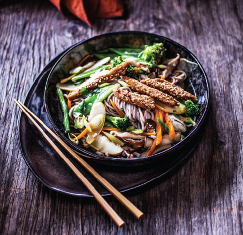 This one-dish meal combines delicious flavor with tremendous energy. Soba noodles made from strengthening buckwheat provide enduring stamina. The rich protein of fried seitan gives us great stamina, and just so things don’t get too heavy, there are loads of lightly cooked veggies for freshness.