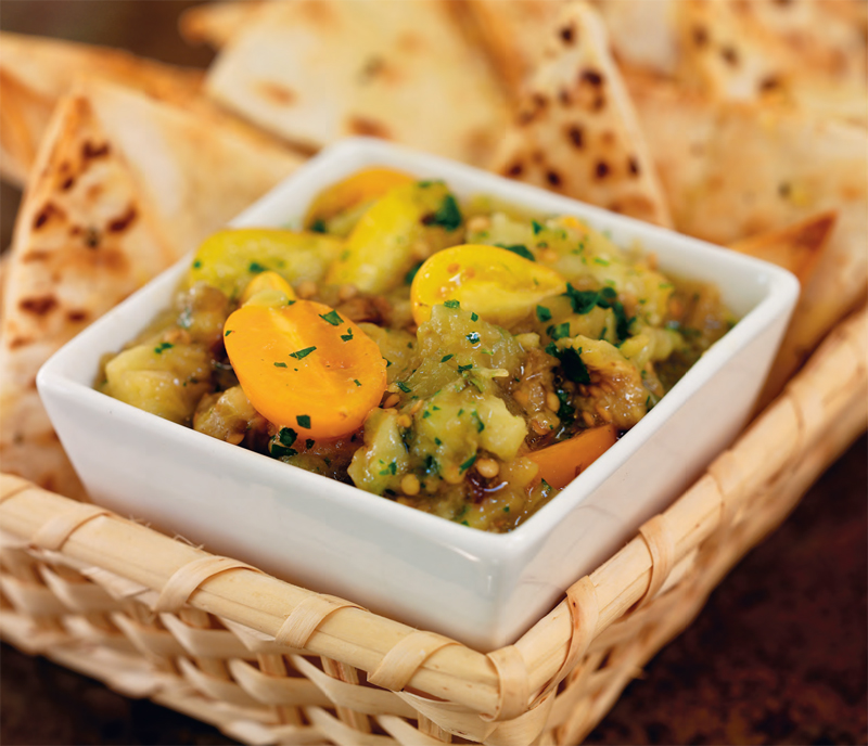 If your eggplant/aubergine has a lot of large seeds, remove them after roasting. Sun Gold tomatoes add sweetness and vibrant color to the dip, and parsley adds a fresh component. A sparkling wine from Mendocino is a nice surprise with this creamy dish, and a good companion to the crisp pitas.