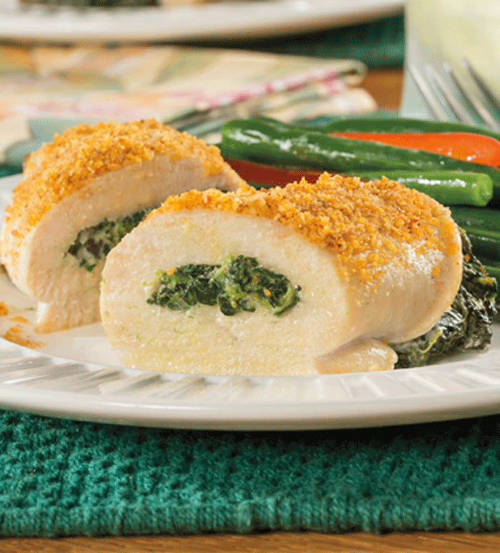 - Transfer mushrooms to a medium bowl and add spinach, cream cheese, nutmeg, and pepper; mix well. Spoon 2 tablespoons mixture over each chicken cutlet. Roll up and secure with toothpicks. Place rolls in a 9 × 13-inch baking dish.