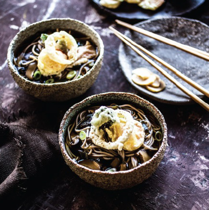 - To assemble, rinse the noodles quickly and mound in individual serving bowls. Ladle the broth over the noodles and top generously with the tempura veggies. Serve immediately, garnished with fresh scallions.